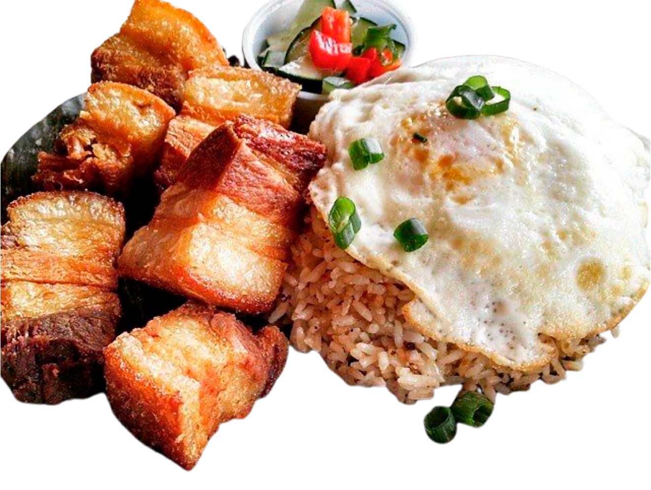 A popular Filipino pork dish that is stewed in lemongrass, garlic, bay leaves, garlic and onions then deep-fried to perfection. It is golden and crunchy on the outside but moist and flavorful inside. Served with Garlic Fried Rice, seasoned sunny side up eggs, atchara(pickled vegetables) and lechon sauce.